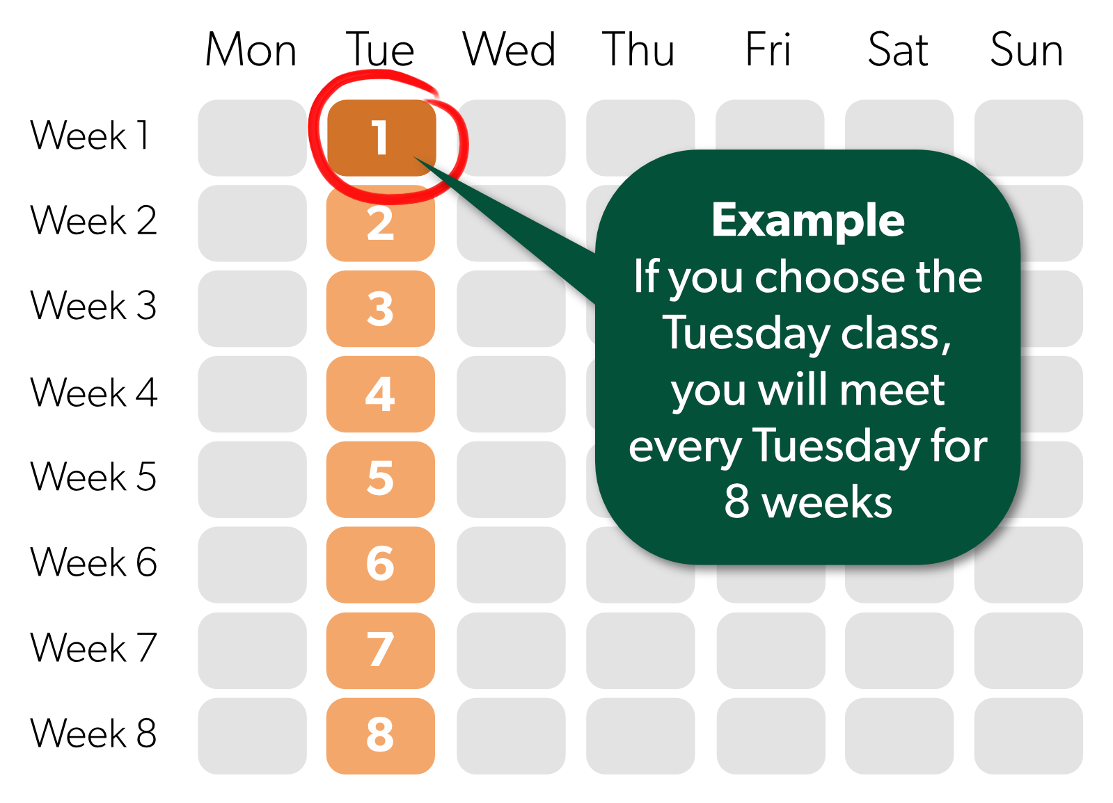 You will need to attend 1 x live class per week, which will be at the same time every week.