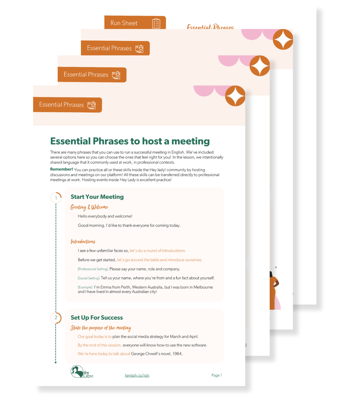 We’ve created a handy PDF so that you can review all 40 phrases that you learned in this lesson & run professional meetings at work! Print it out and keep it beside you until you can use them easily and automatically.